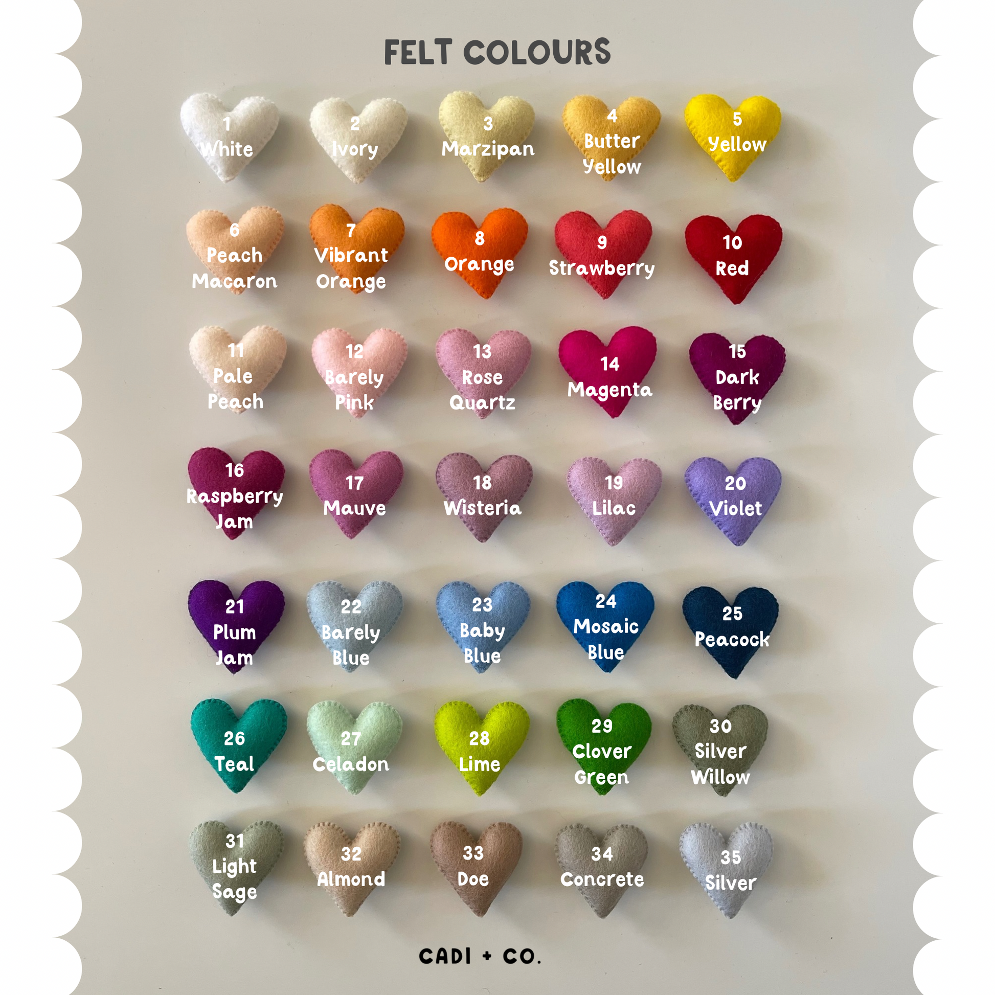 Made from cotton calico with a wool felt letter attached, our flags are 28cm tall and 25cm wide.