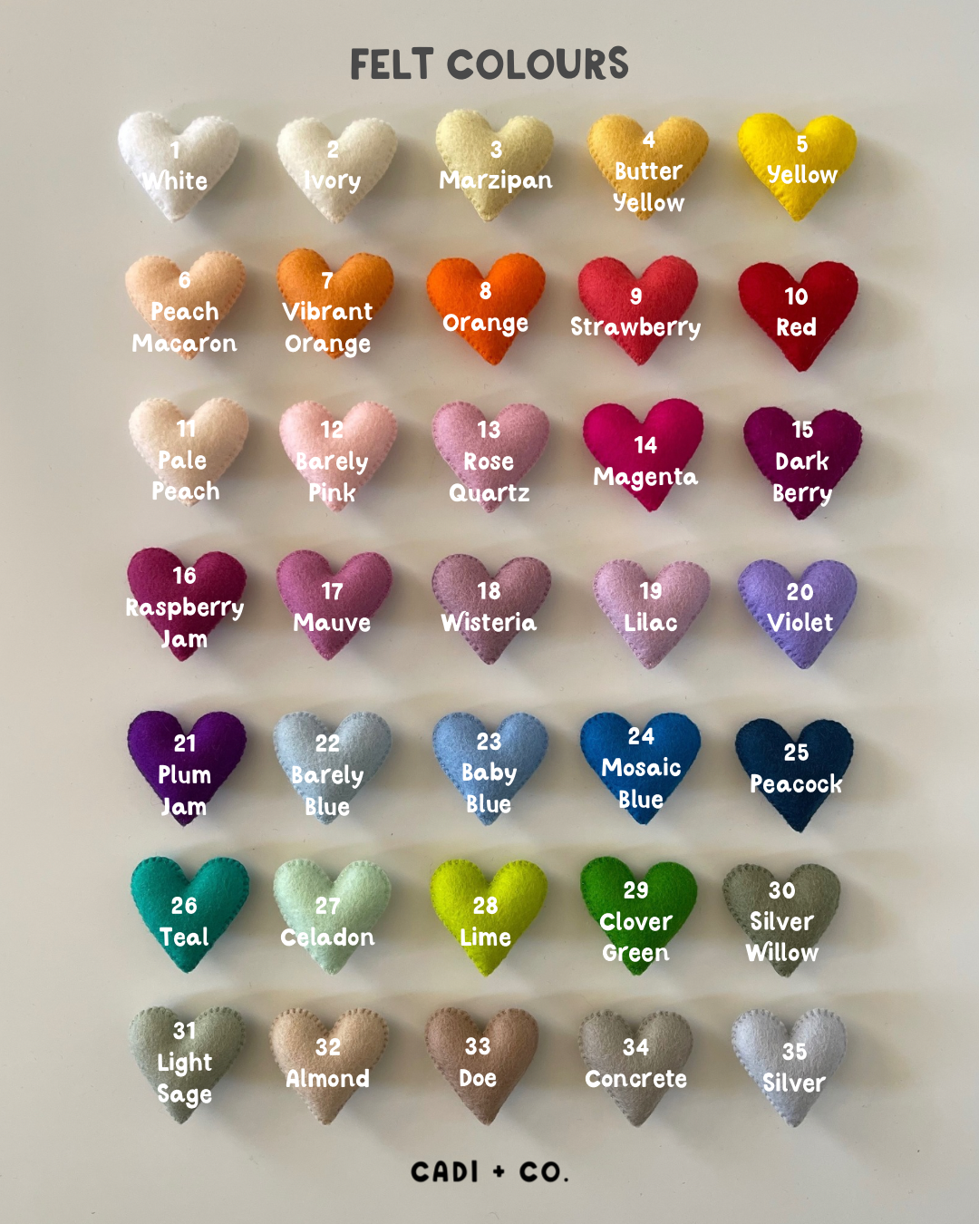 Bows are made of wool felt with the choice of 30+ colours. Bow measures 10cm x 10cm.