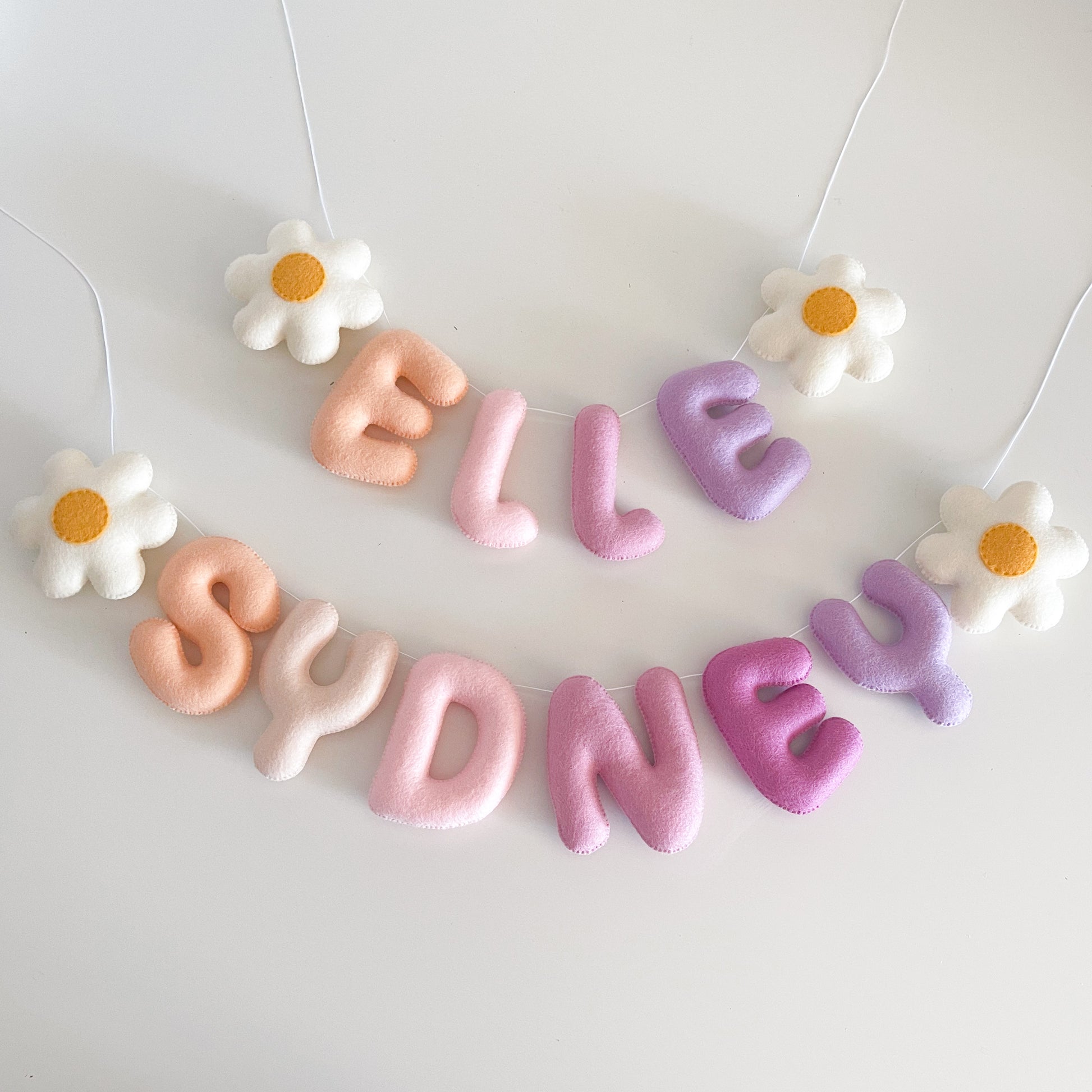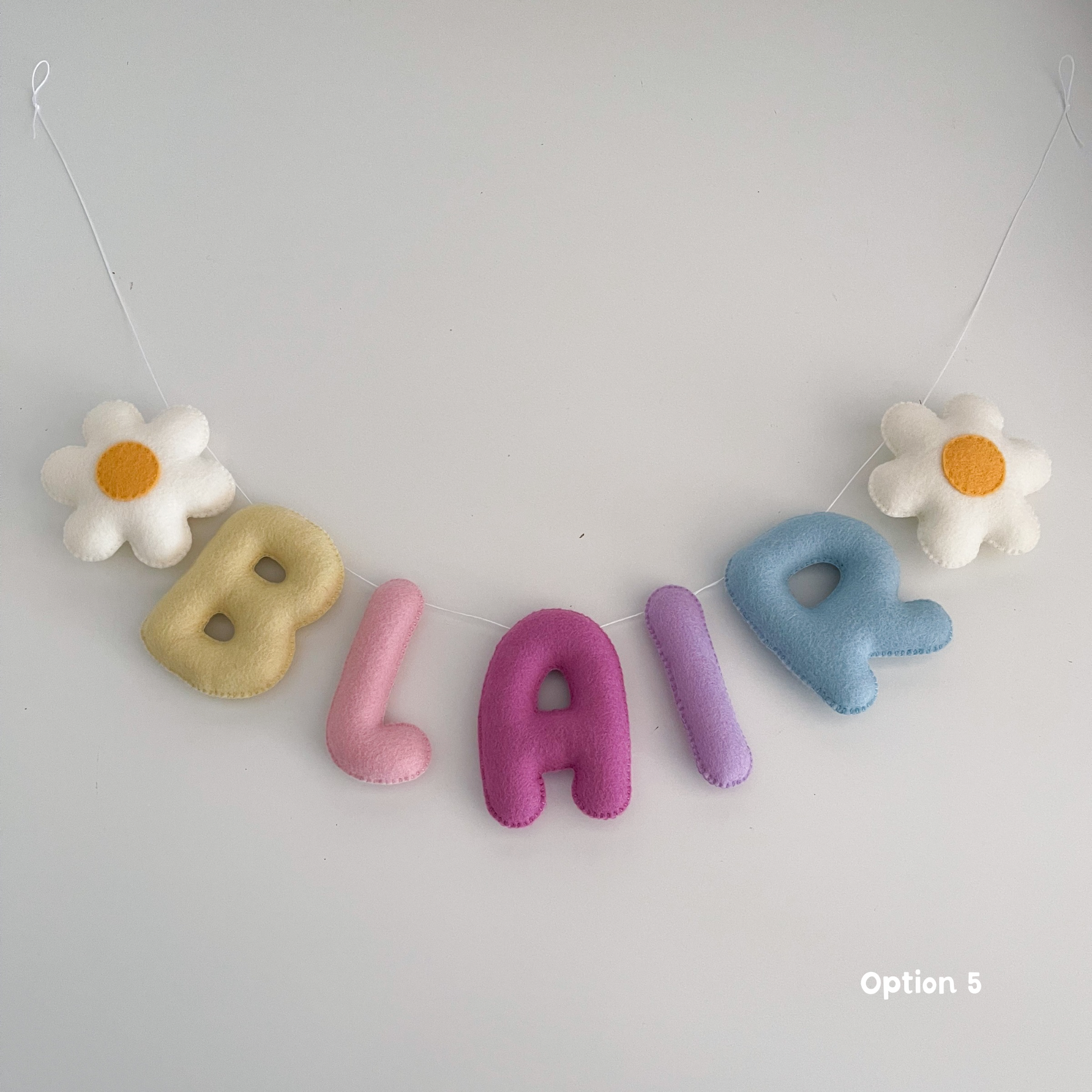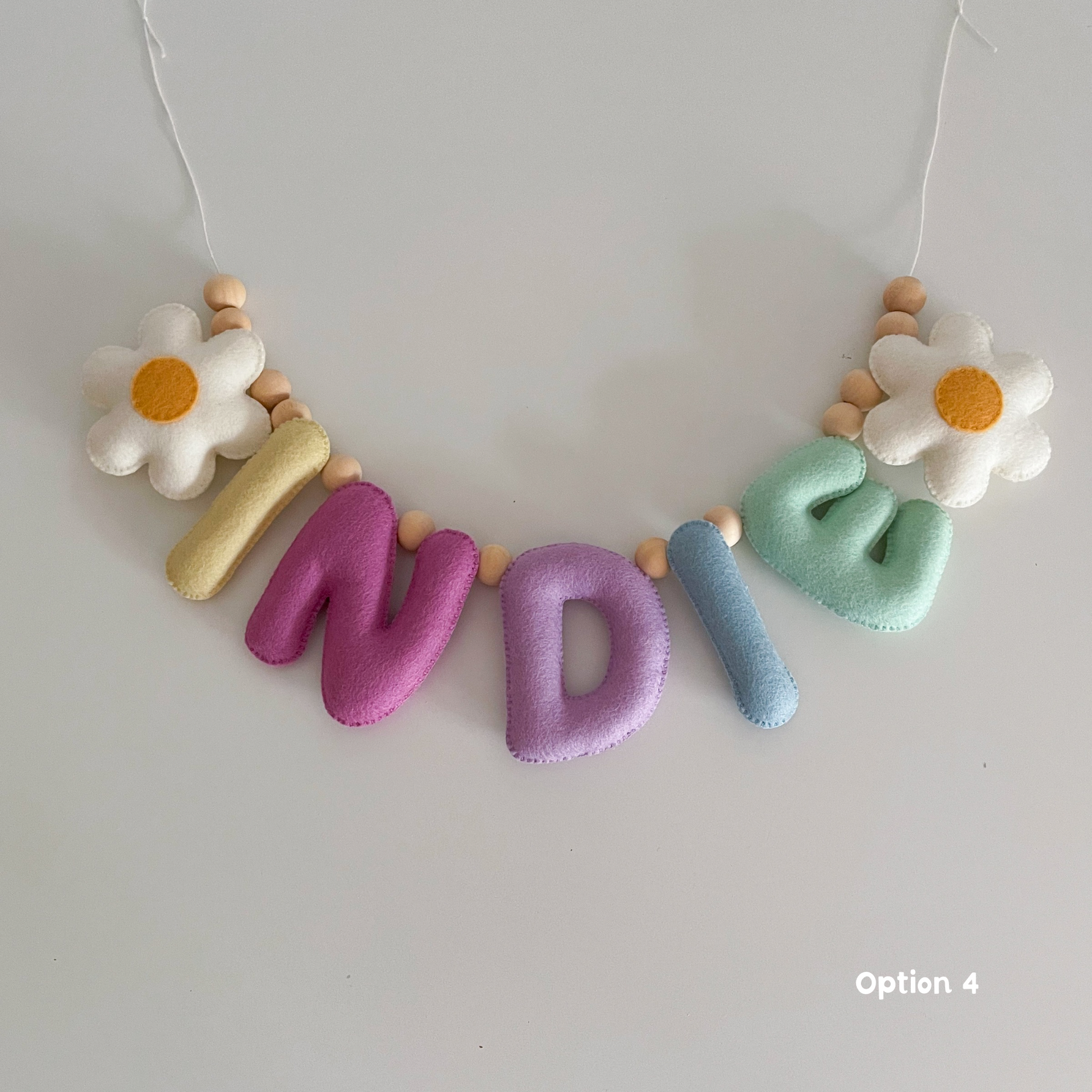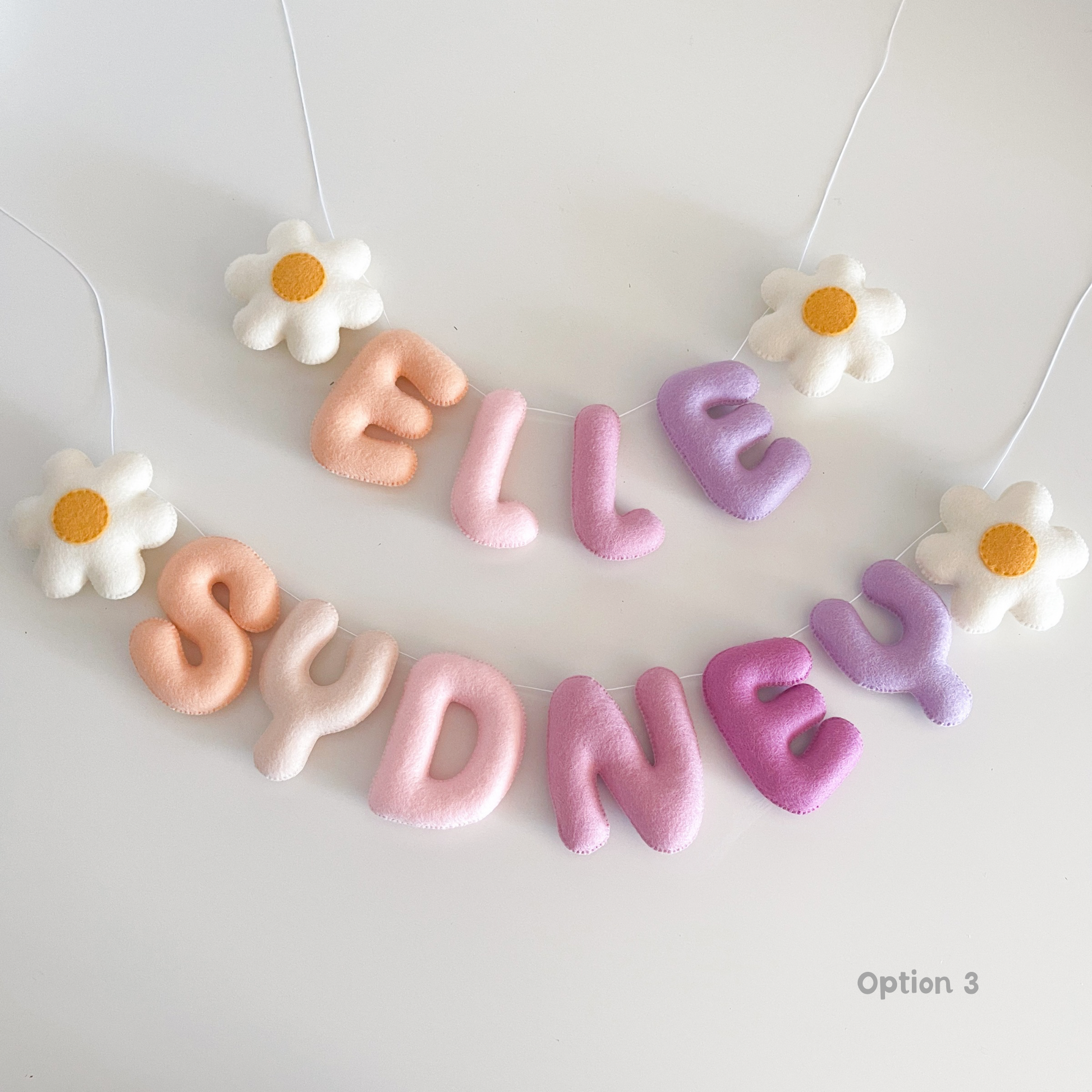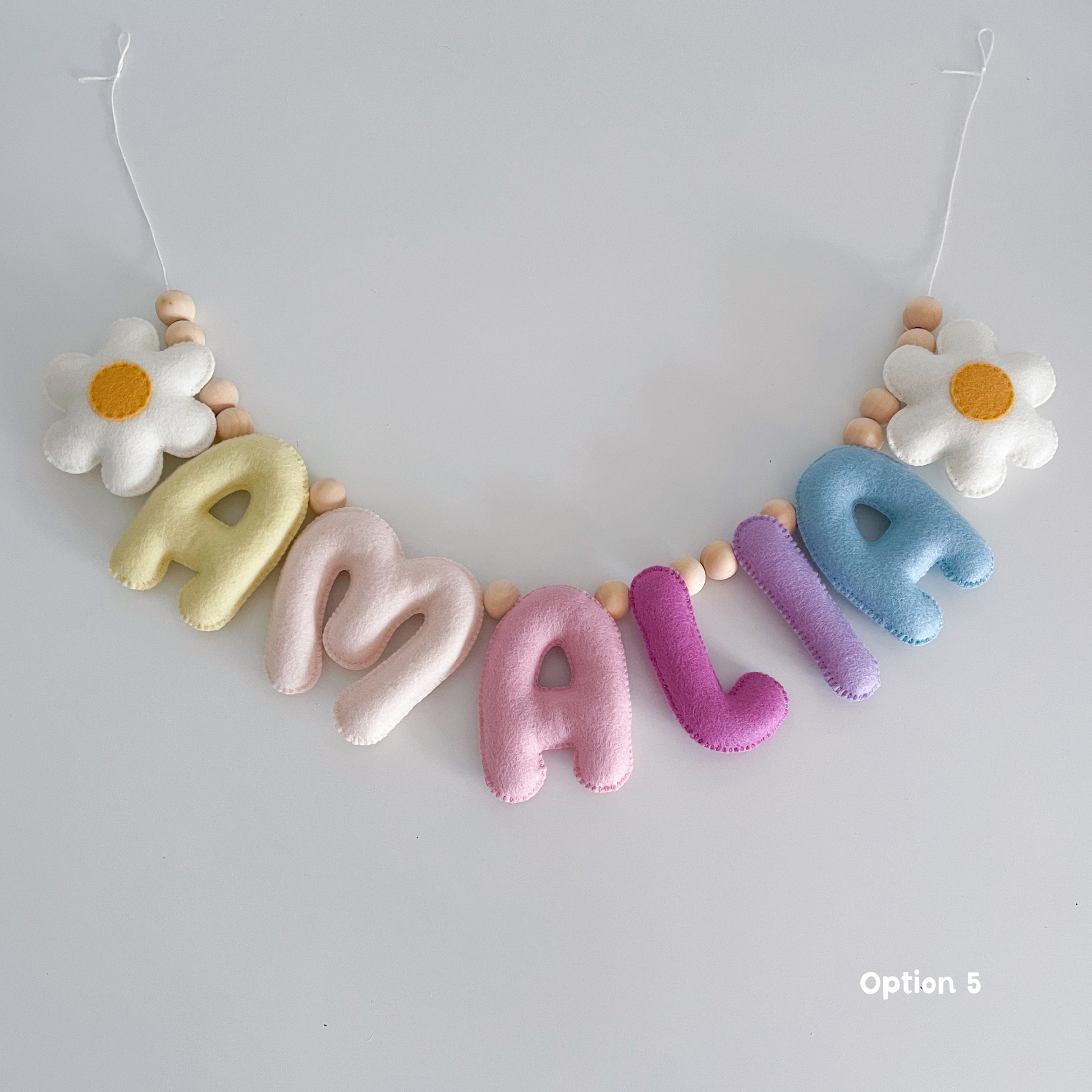 This name garland includes a flower at each end, with your choice of colour combination from the options listed.