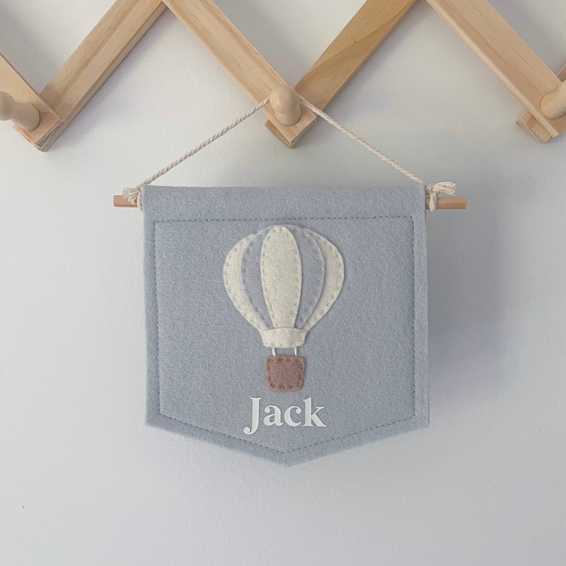 Made of wool felt, these mini flags are custom made to order with the choice of flag shape, hot air balloon & flag colour (balloon stripes and flag will be the same colour), & font for the name. Name will be white vinyl.