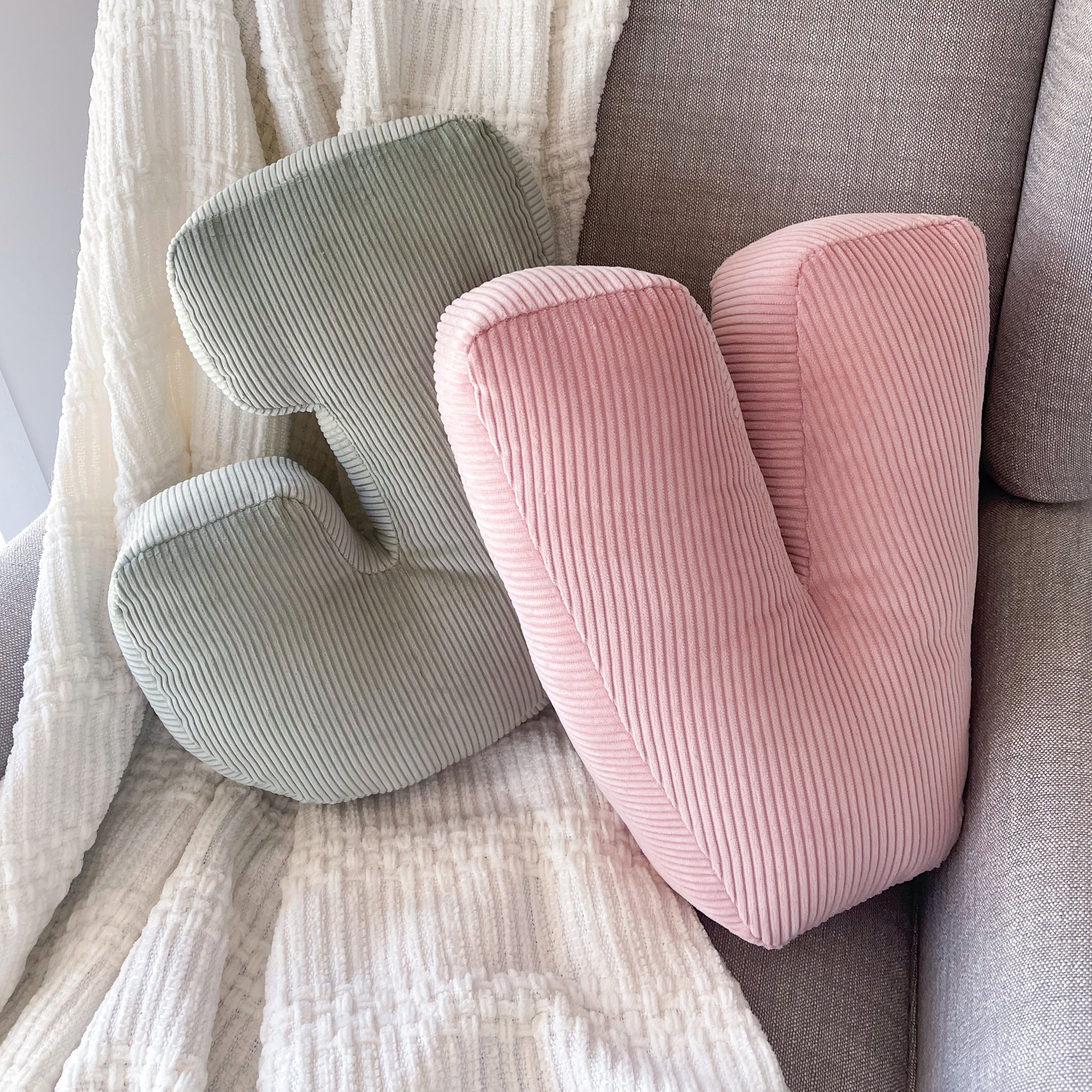 These letter cushions are made of cotton corduroy with a polyester filling. Cushions measure approx. 40 cm tall and 10 cm deep, with the width varying depending on the letter chosen.