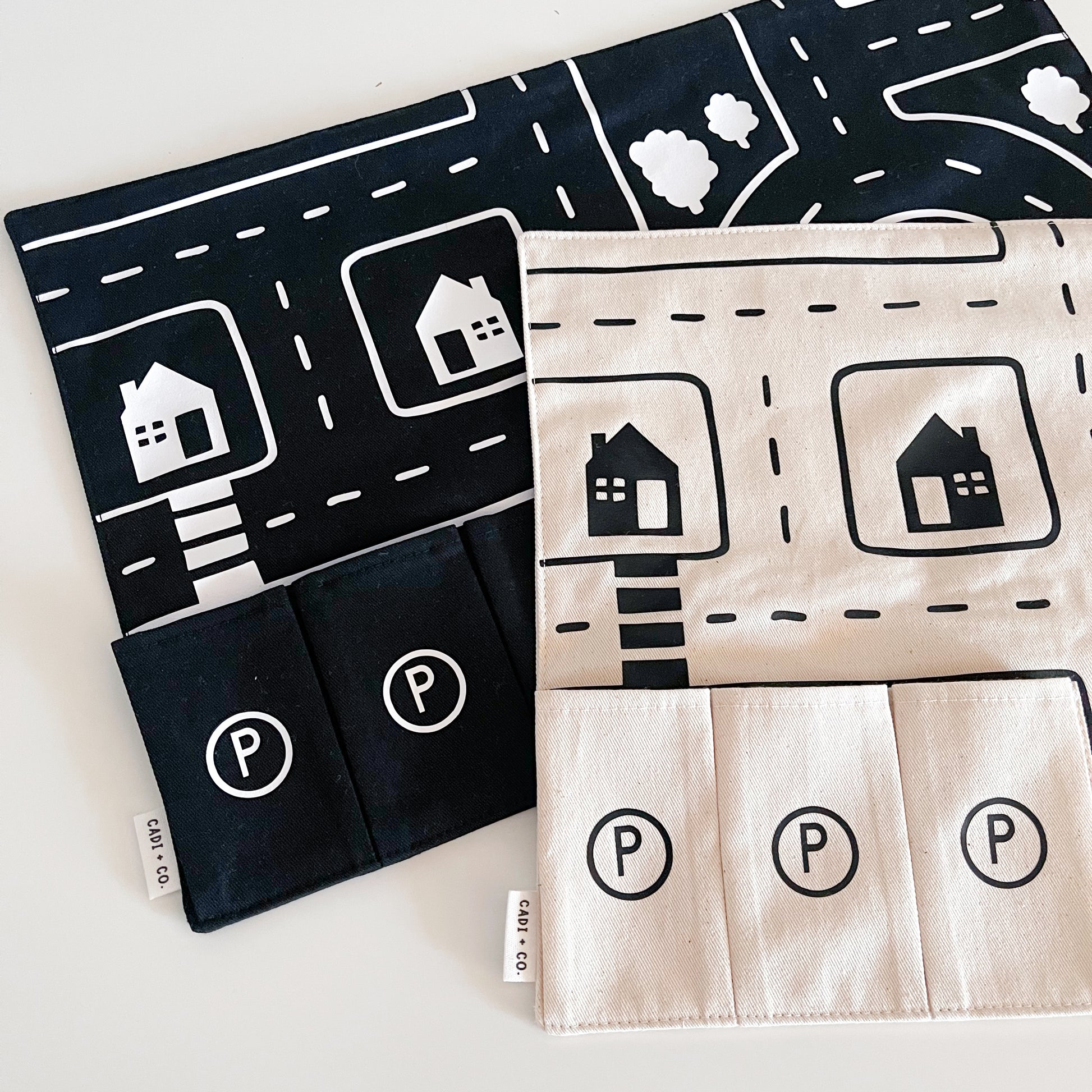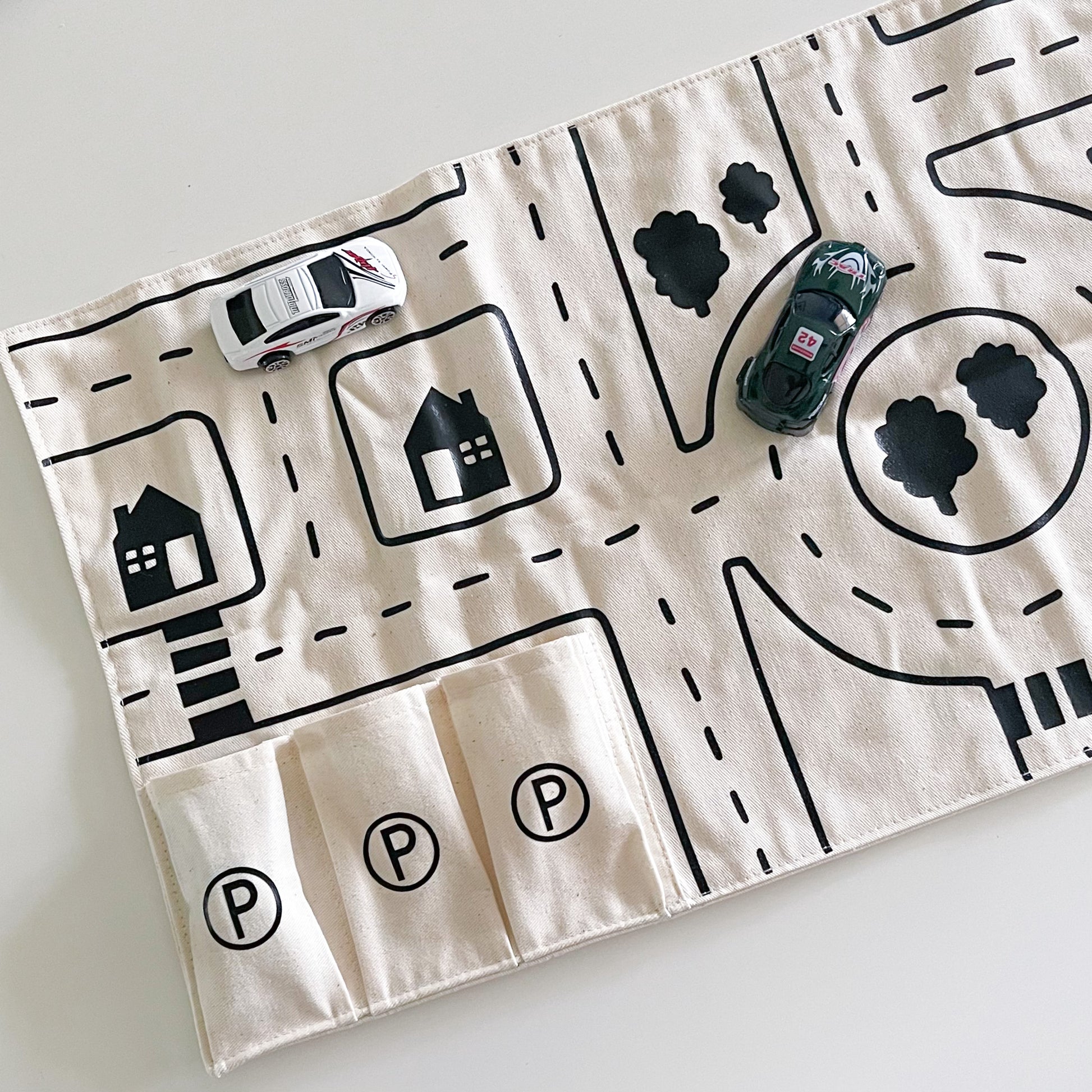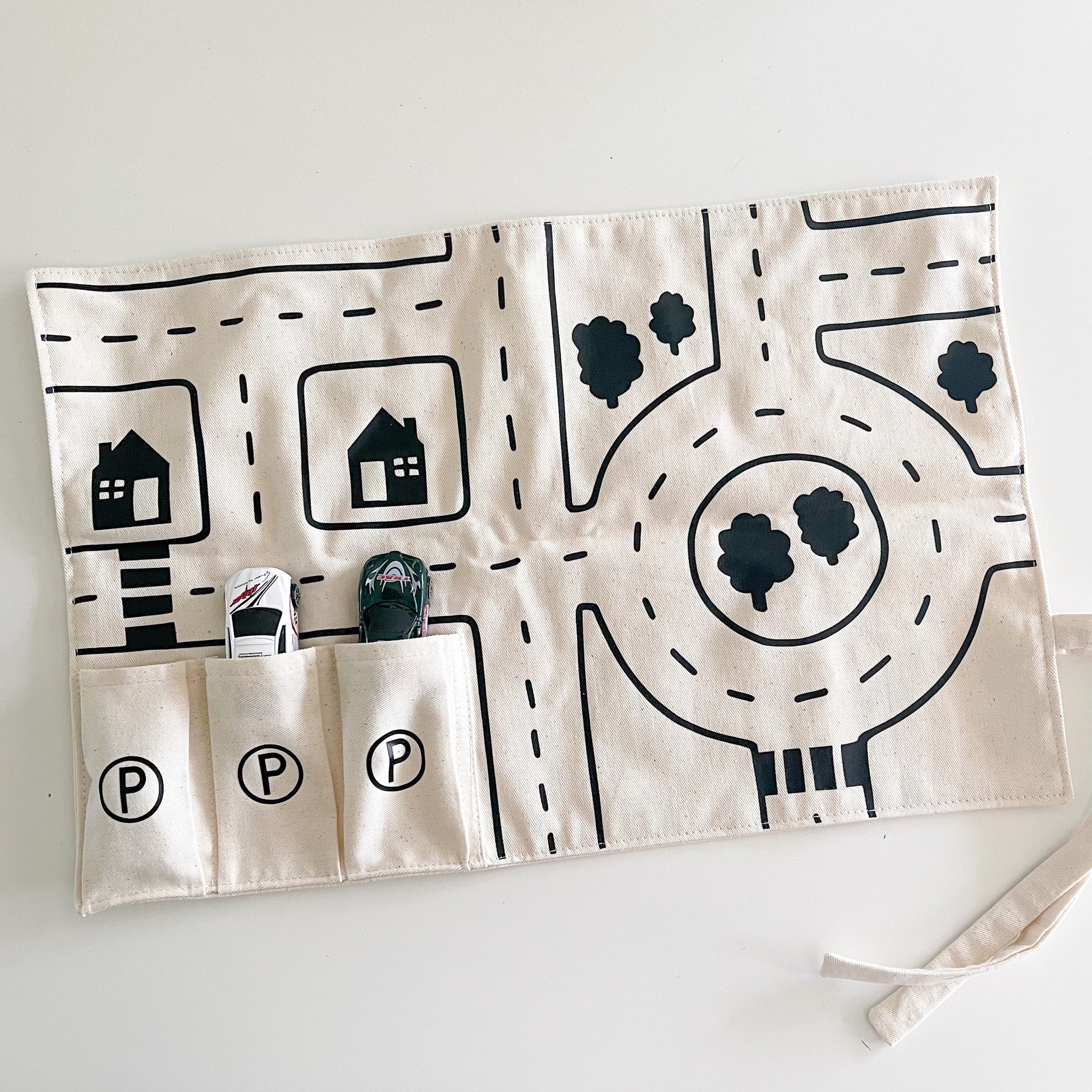 Our portable toy car play mat is the perfect addition to your bag, to keep your car loving little one entertained when heading out & about!