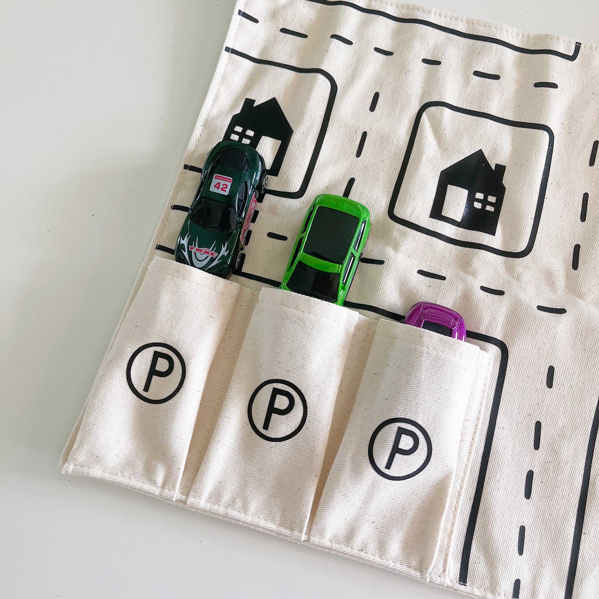 Please note toy cars are not included with purchase - most toy cars will fit in the mat pockets (pictured are Kmart diecast cars).